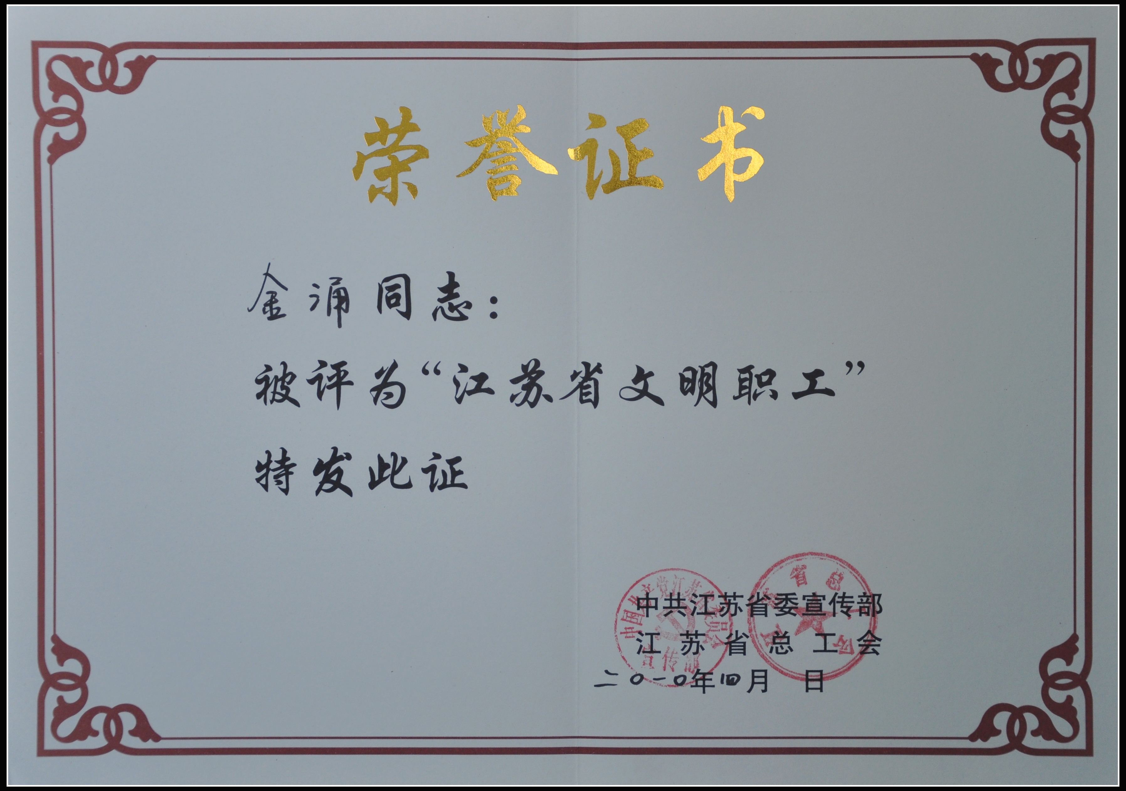金涌榮獲“江蘇省文明職工”稱號