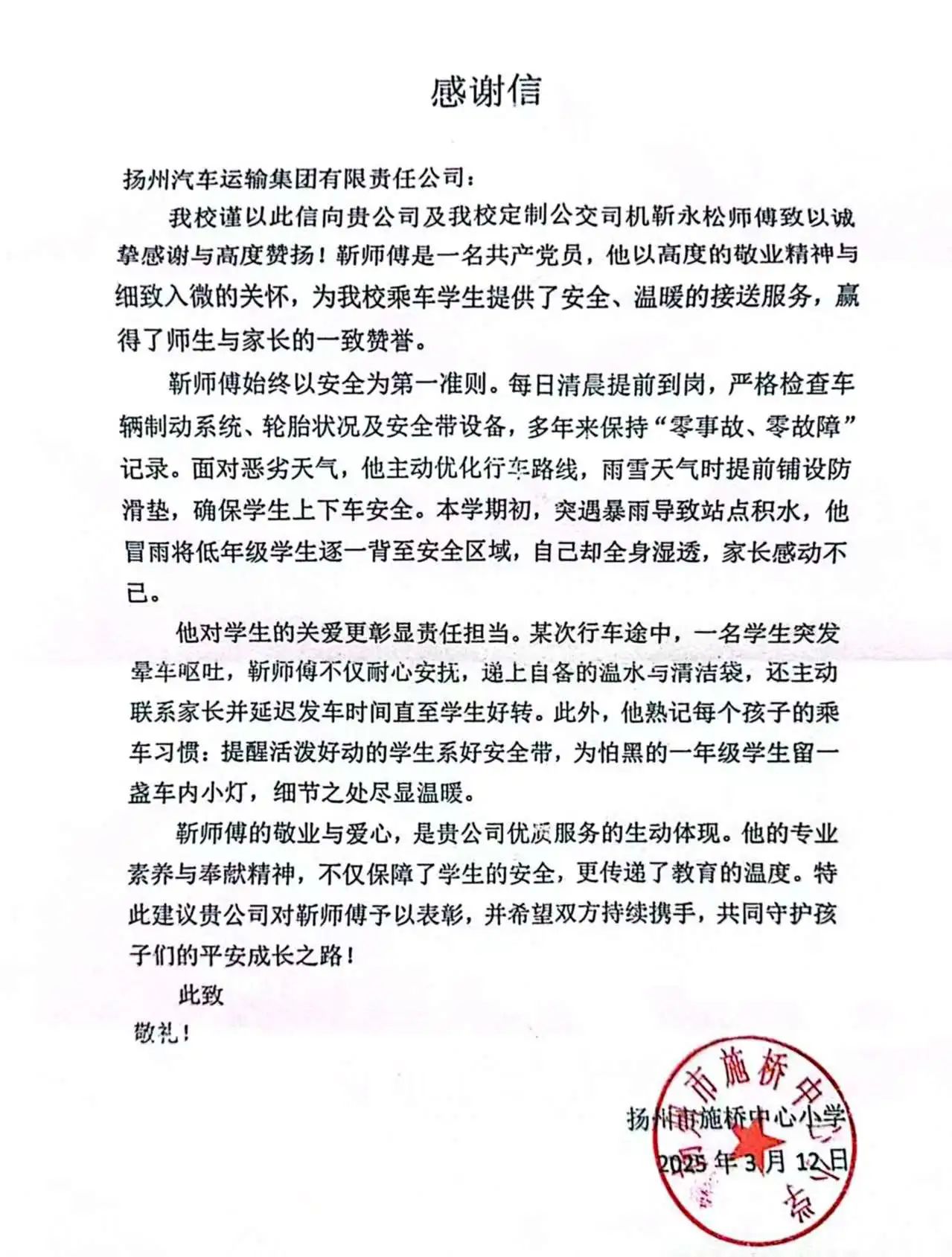 紙短情長(zhǎng) 愛(ài)有回響丨揚(yáng)汽集團(tuán)校車(chē)司機(jī)優(yōu)質(zhì)服務(wù)獲學(xué)校點(diǎn)贊